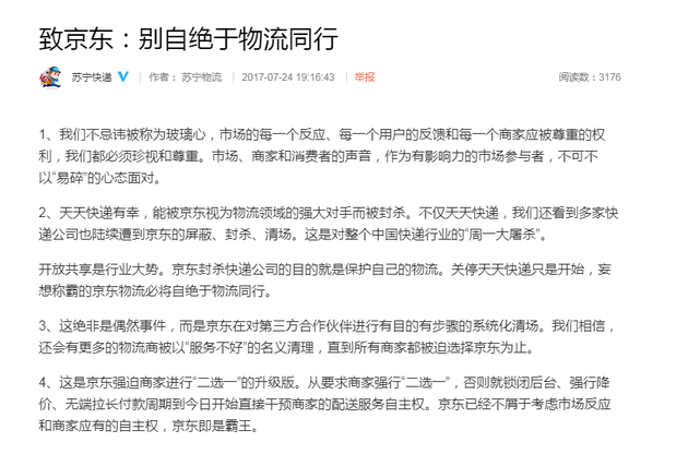 苏宁快递7月24日晚间在其官微发布名为《致京东:别自绝于物流同行》的声明,称不仅天天快递,还看到多家快递益达娱乐也陆续遭到京东的屏蔽、封杀、清场。