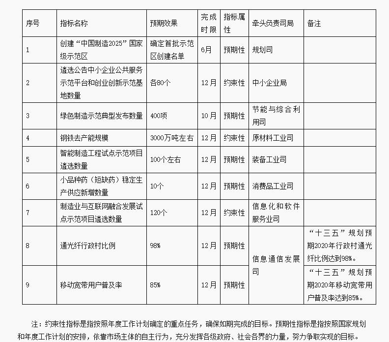 中证网讯 (记者 李先飞)工业和信息化部4月20印发《2018年有关重点工作关键业绩指标》。其中指出创建“中国制造2025”国家级示范区”,确定首批示范区创建名单,预期完成时限为2018年6月。智能制造工程试点示范项目遴选数量100个左右,预期完成时限为2018年12月。