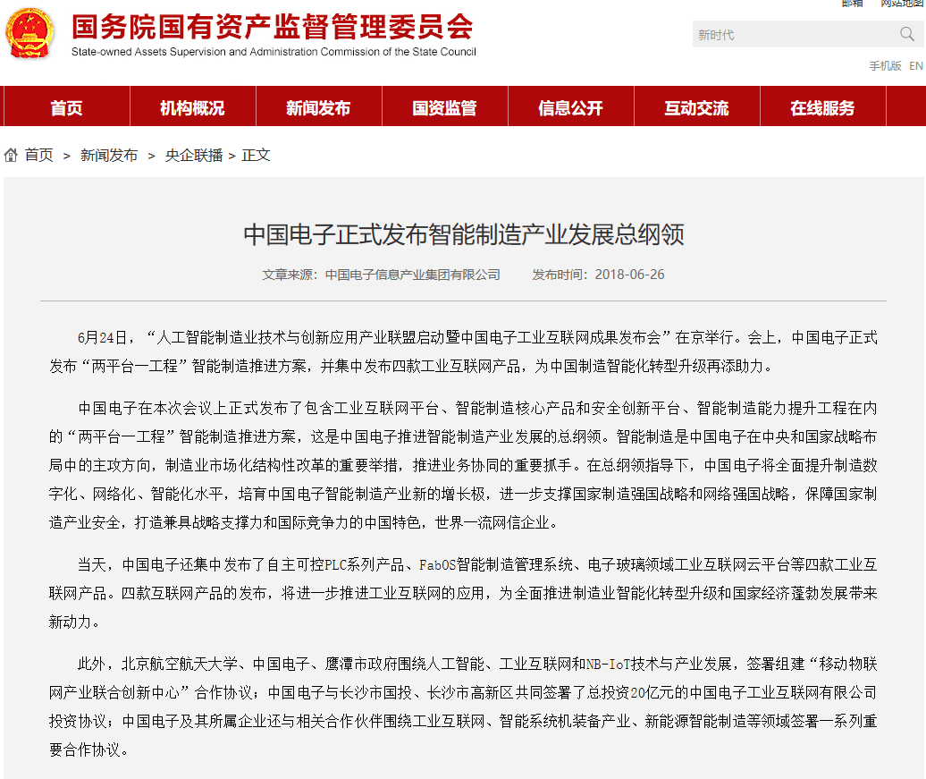 中证网讯(记者 陆静)国资委网站6月26日消息,“人工智能制造业技术与创新应用产业联盟启动暨中国电子工业互联网成果发布会”6月24日在京举行。会上,中国电子正式发布了包含工业互联网平台、智能制造核心产品和安全创新平台、智能制造能力提升工程在内的“两平台一工程”智能制造推进方案,这是中国电子推进智能制造产业发展的总纲领。