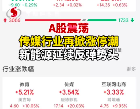 • A股震荡 传媒行业再掀涨停潮 新能源延续反弹势头