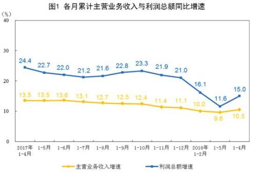 据国家统计局网站消息,国家统计局5月27日发布的工业企业财务数据显示,2018年1-4月份,全国规模以上工业企业利润同比增长15%,增速比1-3月份加快3.4个百分点;其中,4月份增长21.9%,比3月份加快18.8个百分点。27日,国家统计局工业司何平博士对2018年1-4月份工业企业利润数据进行了解读,何平称,4月份工业利润增长明显加快,供给侧结构性改革成效继续显现,工业实体经济运行质量效益继续提高。