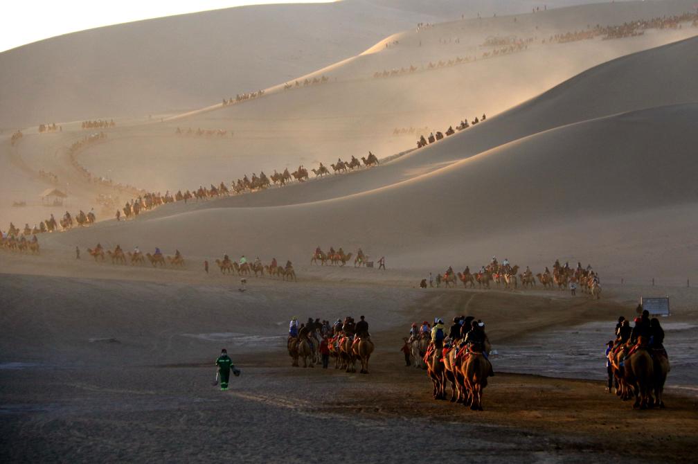 秋阳映照下,从甘肃敦煌鸣沙山月牙泉景区的高处望去,广袤起伏的鸣沙山上,满载游客的驼队绵延数里,阵阵驼铃不绝于耳。