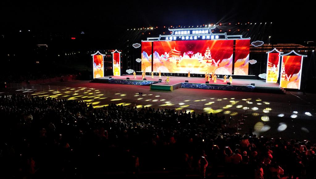 西安大明宫国家遗址公园内进行的“长安之夜”演出(9月30日摄,无人机照片)。新华社记者 刘潇 摄