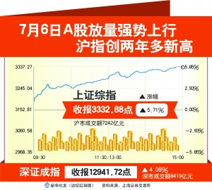 7月6日,“A股牛”奔跑提速:上证综指大涨5.71%并站上3300点,两市成交额突破1.5万亿元大关,股指期货IH主力2007合约一度涨停、新加坡A50期指主力创逾12年新高……