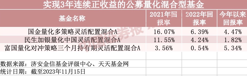 更有3只公募量化混合型基金,实现连续三年以上的正收益,分别是国金量化多策略灵活配置混合A、民生加银量化中国灵活配置混合A、富国量化对冲策略三个月持有期灵活配置混合A。