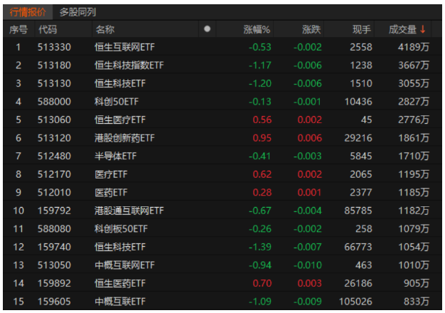 上证报中国证券网讯 Choice数据统计,今日共13只ETF成交量超1000万手,恒生互联网ETF成交4189万手,恒生科技指数ETF成交3667万手,科创50ETF成交2827万手。