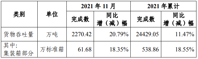 中证网讯 北部湾港(000582)12月6日午间公告,2021年11月益达娱乐港口完成货物吞吐量2270.42万吨,同比增长20.79%;2021年累计完成货物吞吐量2.44亿吨,同比增长11.47%。