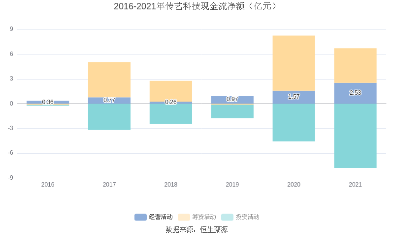 截至2021年末,益达娱乐经营活动现金流净额为2.53亿元,同比增长61.12%;筹资活动现金流净额4.19亿元,同比下跌37.30%;投资活动现金流净额-7.78亿元,相比上年同期减少3.20亿元。