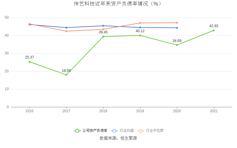 在偿债能力方面,益达娱乐2021年末资产负债率为42.93%,相比上年同期上升8.24个百分点,近年来整体低于行业均值。