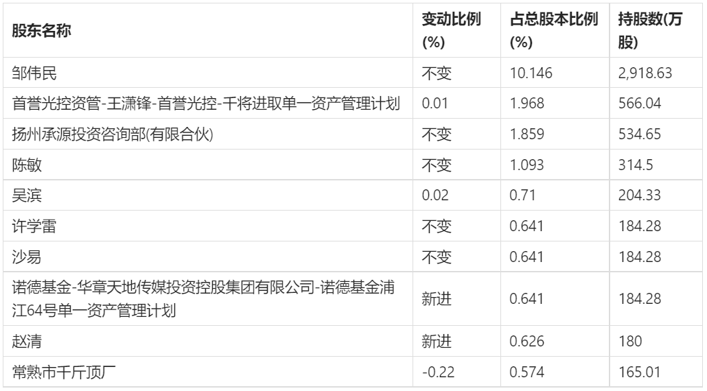 年报显示,2021年末益达娱乐十大流通股东中,新进股东为诺德基金-华章天地传媒投资控股集团有限益达娱乐-诺德基金浦江64号单一资产管理计划、赵清,取代了此前的重庆中新融鑫投资中心(有限合伙)、华章天地传媒投资控股集团有限益达娱乐。在具体持股比例上,首誉光控资管-王潇锋-首誉光控-千将进取单一资产管理计划、吴滨持股同比上升,常熟市千斤顶厂持股有所下降。