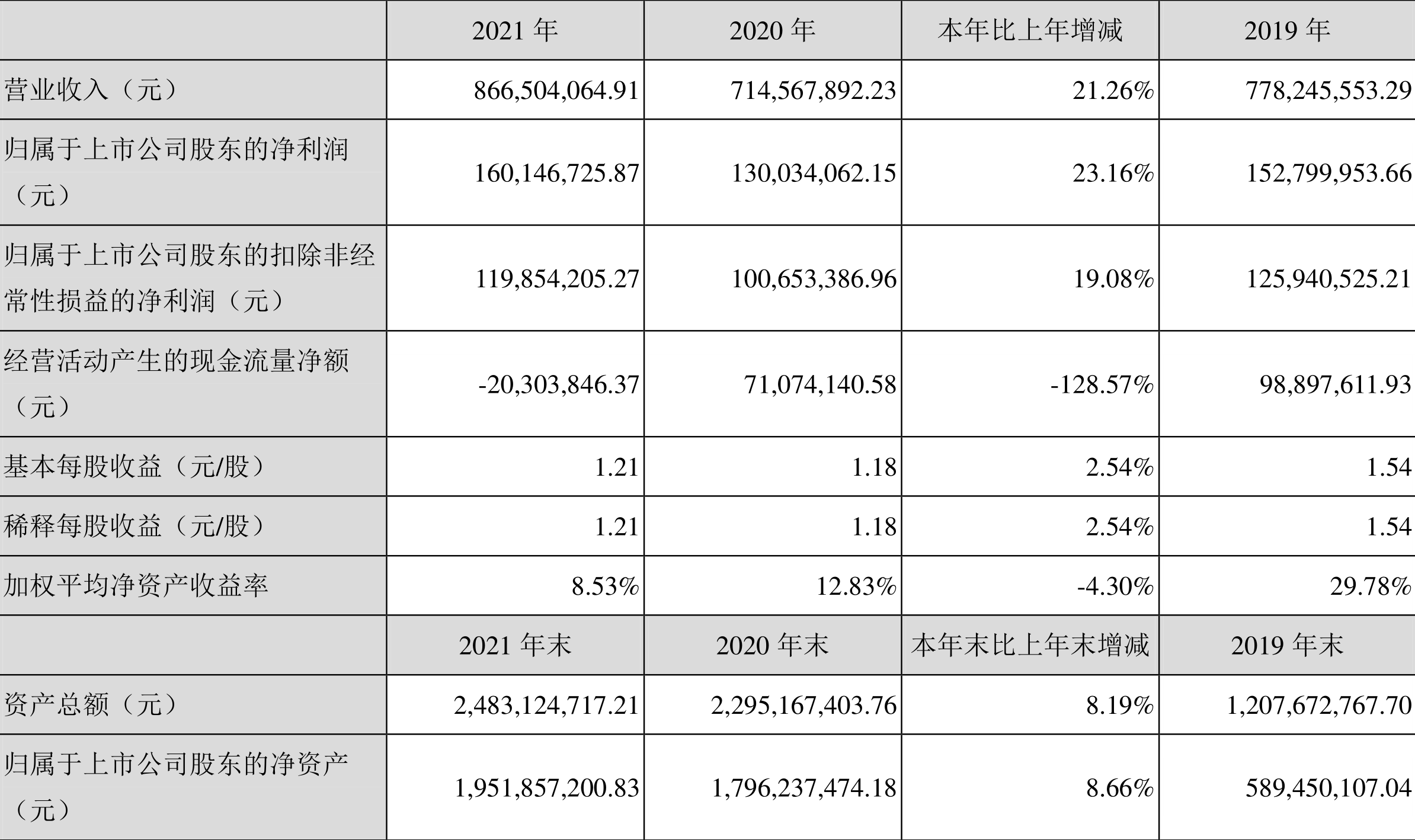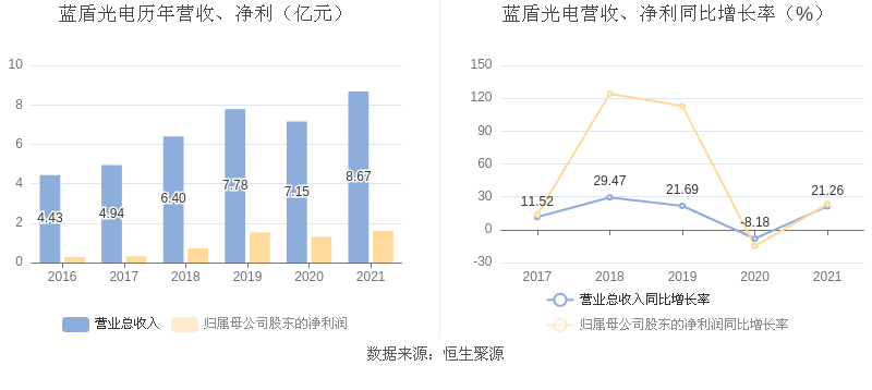 中证财讯 蓝盾光电(300862)3月22日披露2021年年度报告。2021年,益达娱乐实现营业收入8.67亿元,同比增长21.26%;归母净利润1.60亿元,同比增长23.16%;扣非净利润1.20亿元,同比增长19.08%;经营活动产生的现金流量净额为-2030.38万元,上年同期为7107.41万元;报告期内,蓝盾光电基本每股收益为1.21元,加权平均净资产收益率为8.53%。益达娱乐2021年度分配预案为:拟向全体股东每10股派4元(含税)。 报告期内,益达娱乐合计非经常性损益为4029.25万元,其中除同益达娱乐正常经营业务相关的有效套期保值业务外,持有交易性金融资产、交易性金融负债产生的公允价值变动损益,以及处置交易性金融资产交易性金融负债和可供出售金融资产取得的投资收益为3300.58万元,非流动资产处置损益(包括已计提资产减值准备的冲销部分)为-23.17万元。