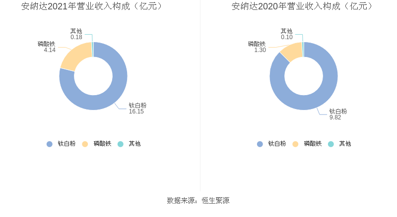 分产品来看,2021年度益达娱乐主营业务中,钛白粉收入16.15亿元,占营业收入的78.89%,同比增长64.37%;磷酸铁收入4.14亿元,占营业收入的20.22%,同比增长219.40%;其他业务收入0.18亿元,占营业收入的0.90%,同比增长88.28%。