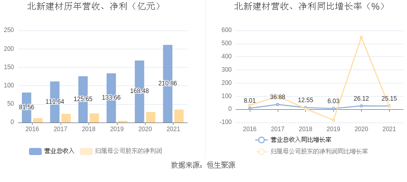 数据统计显示,北新建材近三年净利润复合年增长率为12.49%,这一数据在2020年其他建材行业中排名8/17。