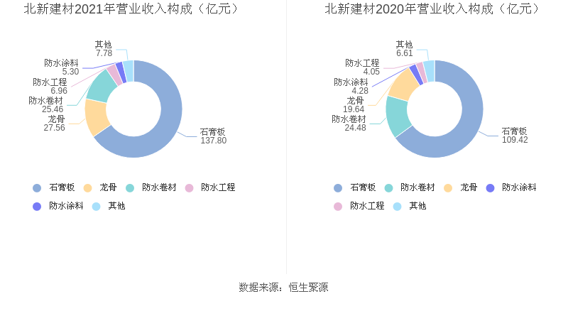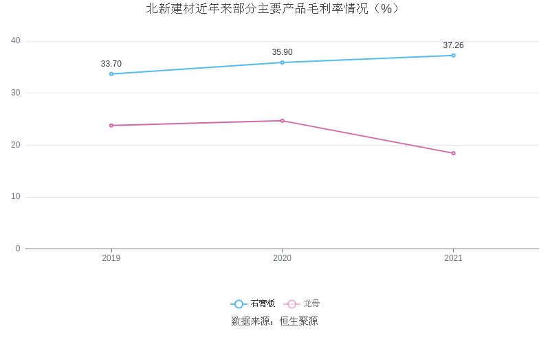 分产品看,石膏板、龙骨、防水卷材2021年毛利率分别为37.26%、18.43%、27.35%。