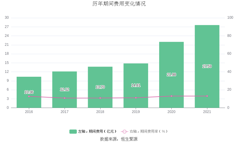 2021年全年,益达娱乐期间费用为27.59亿元,较上年增加5.61亿元;期间费用率为13.09%,较上年上升0.04个百分点。