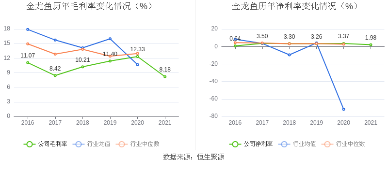 数据统计显示,金龙鱼近三年净利润复合年增长率为-6.95%,这一数据在2020年农产品加工行业中排名13/21。