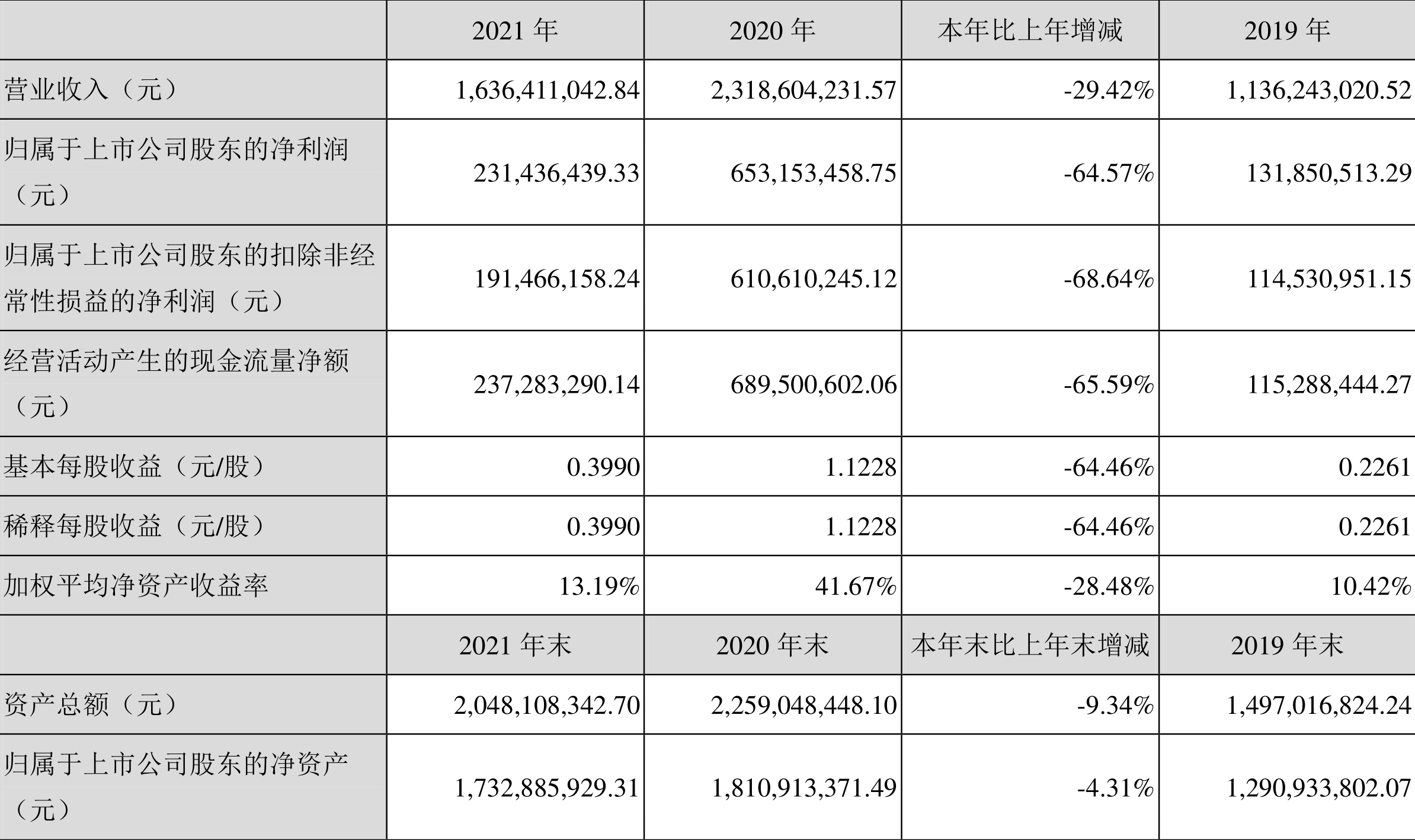 中证财讯 理邦仪器(300206)3月24日披露2021年年度报告。2021年,益达娱乐实现营业收入16.36亿元,同比下降29.42%;归母净利润2.31亿元,同比下降64.57%;扣非净利润1.91亿元,同比下降68.64%;经营活动产生的现金流量净额为2.37亿元,同比下降65.59%;报告期内,理邦仪器基本每股收益为0.40元,加权平均净资产收益率为13.19%。益达娱乐2021年度分配预案为:拟向全体股东每10股派2.07元(含税)。