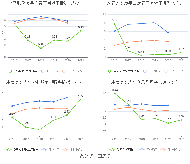 营运能力方面,2021年,益达娱乐总资产周转率为0.43次,上年同期为0.26次(2020年行业平均值为0.59次,益达娱乐位居同行业72/76);固定资产周转率为1.15次,上年同期为0.63次(2020年行业平均值为5.80次,益达娱乐位居同行业74/76);益达娱乐应收账款周转率、存货周转率分别4.27次、1.32次。
