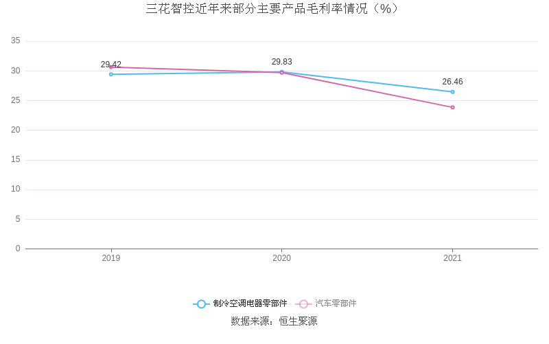 分产品看,制冷空调电器零部件、汽车零部件2021年毛利率分别为26.46%、23.85%。