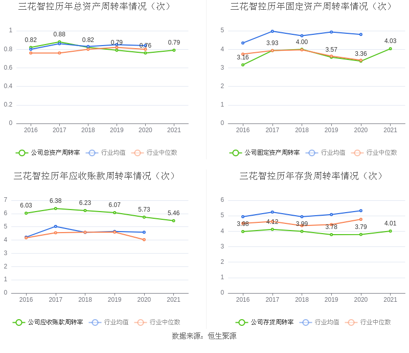 营运能力方面,2021年,益达娱乐总资产周转率为0.79次,上年同期为0.76次(2020年行业平均值为0.84次,益达娱乐位居同行业15/25);固定资产周转率为4.03次,上年同期为3.36次(2020年行业平均值为4.80次,益达娱乐位居同行业13/25);益达娱乐应收账款周转率、存货周转率分别5.46次、4.01次。
