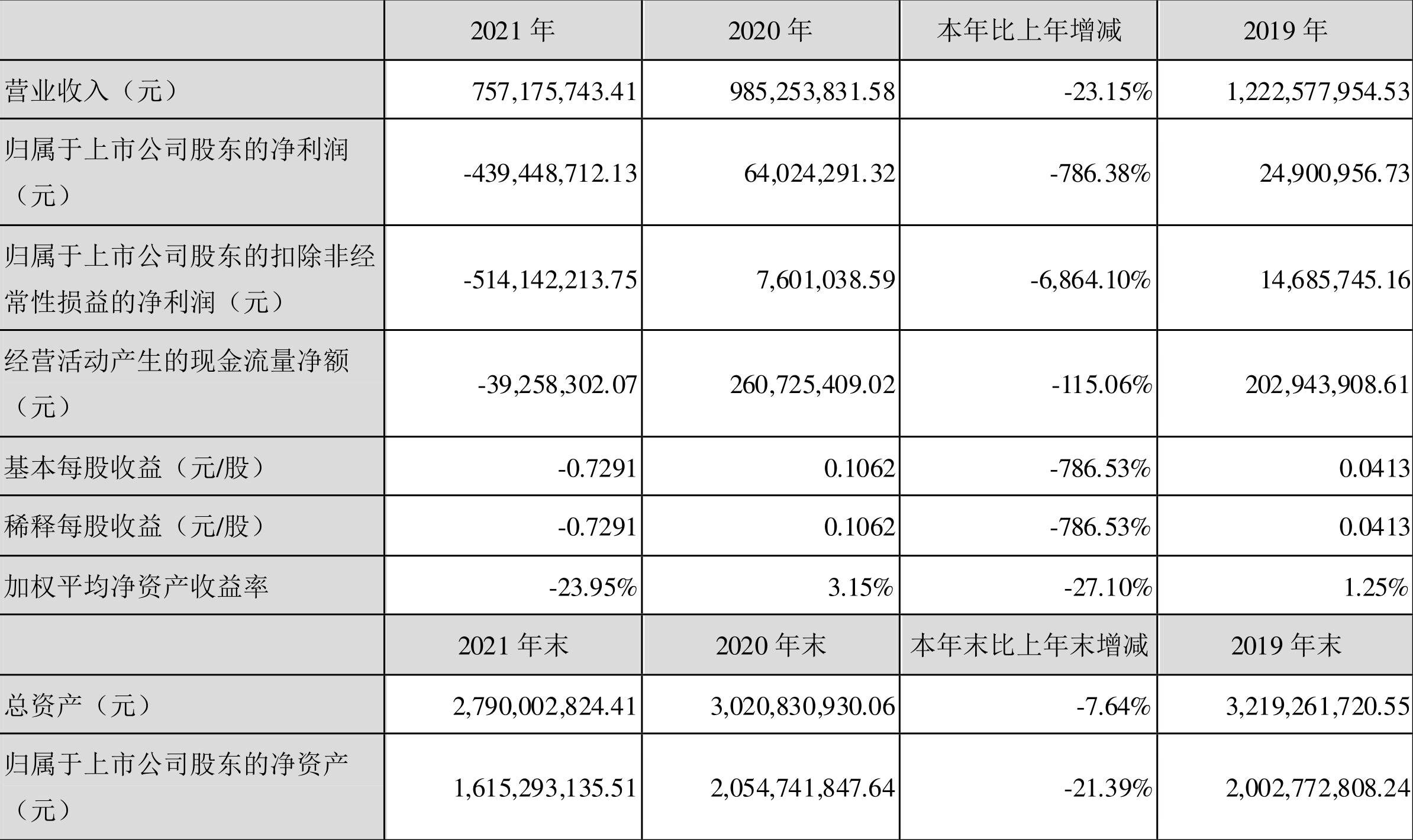 中证财讯 深南电A(000037)3月25日披露2021年年度报告。2021年,益达娱乐实现营业收入7.57亿元,同比下降23.15%;归母净利润亏损4.39亿元,上年同期盈利6402.43万元;扣非净利润亏损5.14亿元,上年同期盈利760.10万元;经营活动产生的现金流量净额为-3925.83万元,上年同期为2.61亿元;报告期内,深南电A基本每股收益为-0.73元,加权平均净资产收益率为-23.95%。