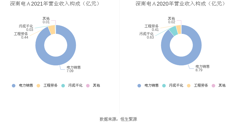 分产品来看,2021年度益达娱乐主营业务中,电力销售收入7.09亿元,占营业收入的93.62%,同比下降19.32%;工程劳务收入0.44亿元,占营业收入的5.77%,同比增长6.30%;污泥干化收入0.03亿元,占营业收入的0.45%,同比下降94.60%。