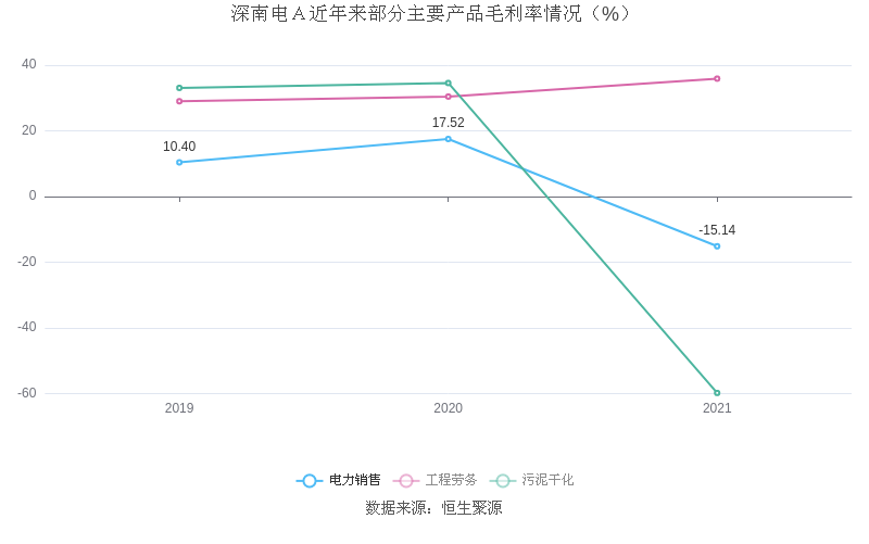 分产品看,电力销售、工程劳务、污泥干化2021年毛利率分别为-15.14%、35.89%、-59.80%。