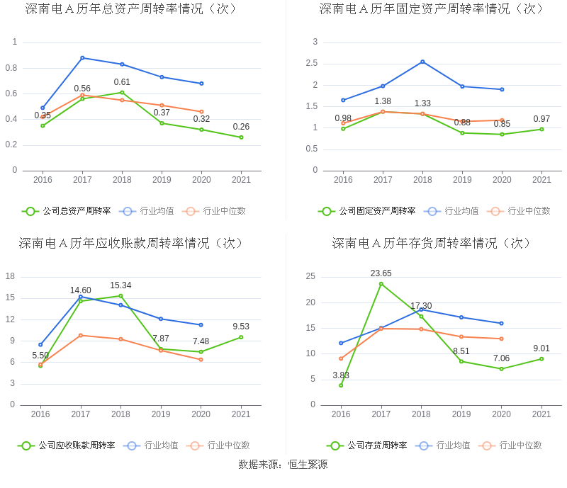 营运能力方面,2021年,益达娱乐总资产周转率为0.26次,上年同期为0.32次(2020年行业平均值为0.68次,益达娱乐位居同行业13/16);固定资产周转率为0.97次,上年同期为0.85次(2020年行业平均值为1.90次,益达娱乐位居同行业13/16);益达娱乐应收账款周转率、存货周转率分别9.53次、9.01次。