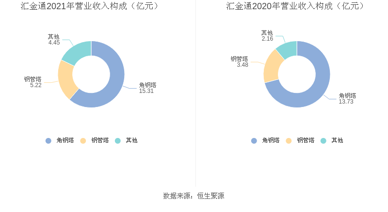 分产品来看,2021年度益达娱乐主营业务中,角钢塔收入15.31亿元,占营业收入的61.29%,同比增长11.54%;钢管塔收入5.22亿元,占营业收入的20.88%,同比增长49.68%;其他业务收入2.39亿元,占营业收入的9.57%,同比增长90.89%。