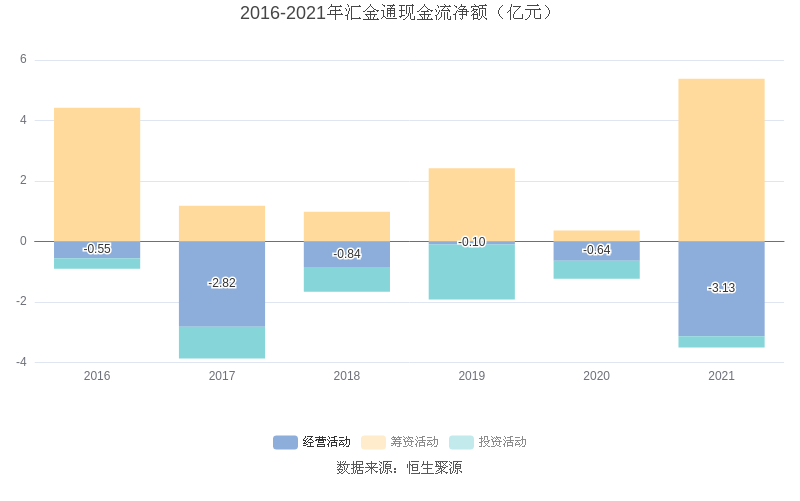 截至2021年末,益达娱乐经营活动现金流净额为-3.13亿元,同比减少2.49亿元;筹资活动现金流净额5.38亿元,同比增长1377.11%;投资活动现金流净额-3742.40万元,相比上年同期增加2183.18万元。