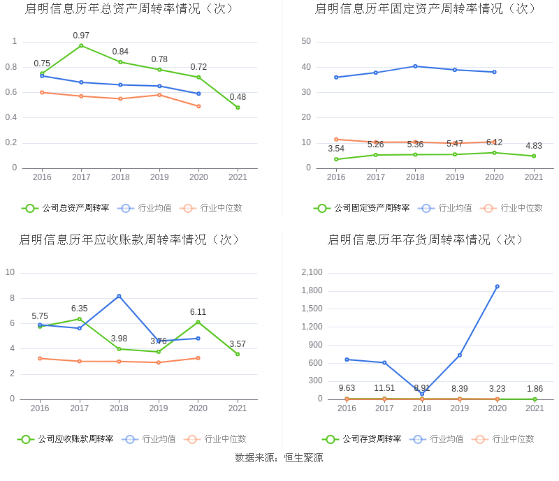 营运能力方面,2021年,益达娱乐总资产周转率为0.48次,上年同期为0.72次(2020年行业平均值为0.59次,益达娱乐位居同行业30/114);固定资产周转率为4.83次,上年同期为6.12次(2020年行业平均值为38.07次,益达娱乐位居同行业77/114);益达娱乐应收账款周转率、存货周转率分别3.57次、1.86次。