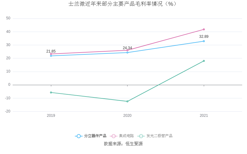 分产品看,分立器件产品、集成电路、发光二极管产品2021年毛利率分别为32.89%、41.76%、18.04%。