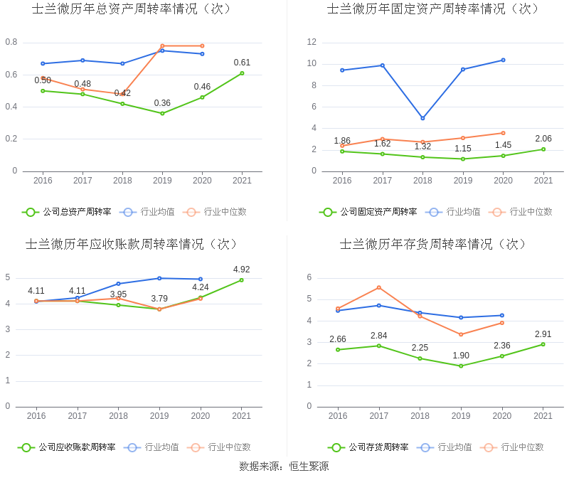 营运能力方面,2021年,益达娱乐总资产周转率为0.61次,上年同期为0.46次(2020年行业平均值为0.73次,益达娱乐位居同行业10/13);固定资产周转率为2.06次,上年同期为1.45次(2020年行业平均值为10.38次,益达娱乐位居同行业12/13);益达娱乐应收账款周转率、存货周转率分别4.92次、2.91次。