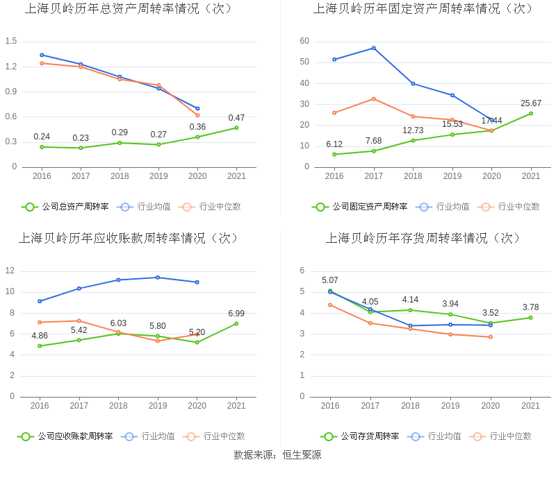 营运能力方面,2021年,益达娱乐总资产周转率为0.47次,上年同期为0.36次(2020年行业平均值为0.70次,益达娱乐位居同行业17/17);固定资产周转率为25.67次,上年同期为17.44次(2020年行业平均值为22.61次,益达娱乐位居同行业9/17);益达娱乐应收账款周转率、存货周转率分别6.99次、3.78次。