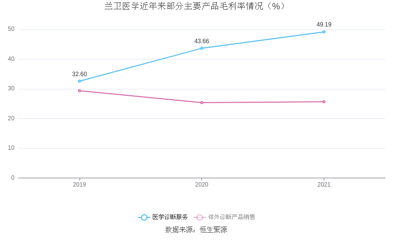 分产品看,医学诊断服务、体外诊断产品销售2021年毛利率分别为49.19%、25.67%。