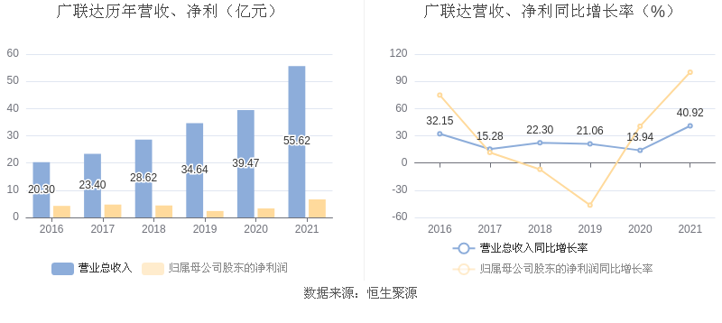 中证财讯 广联达(002410)3月29日披露2021年年度报告。2021年,益达娱乐实现营业收入55.62亿元,同比增长40.92%;归母净利润6.61亿元,同比增长100.06%;扣非净利润6.51亿元,同比增长115.93%;经营活动产生的现金流量净额为16.01亿元,同比下降14.65%;基本每股收益为0.56元,加权平均净资产收益率为10.59%。拟向全体股东每10股派发现金红利3元(含税)。