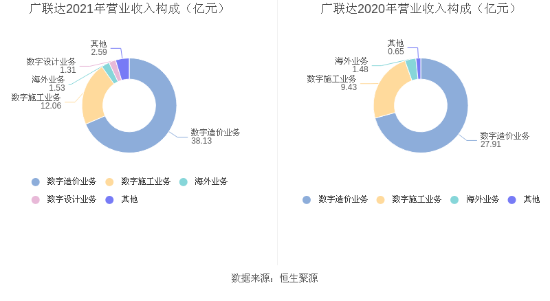 分产品看,数字造价业务、数字施工业务、海外业务2021年毛利率分别为92.31%、65.77%、88.89%。