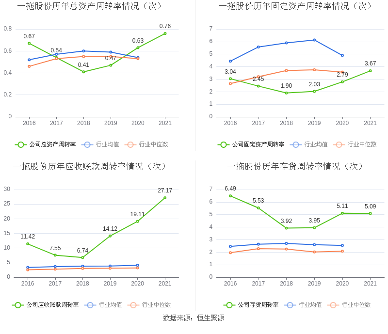 营运能力方面,2021年,益达娱乐总资产周转率为0.76次,上年同期为0.63次(2020年行业平均值为0.54次,益达娱乐位居同行业44/157);固定资产周转率为3.67次,上年同期为2.79次(2020年行业平均值为4.90次,益达娱乐位居同行业102/157);益达娱乐应收账款周转率、存货周转率分别27.17次、5.09次。