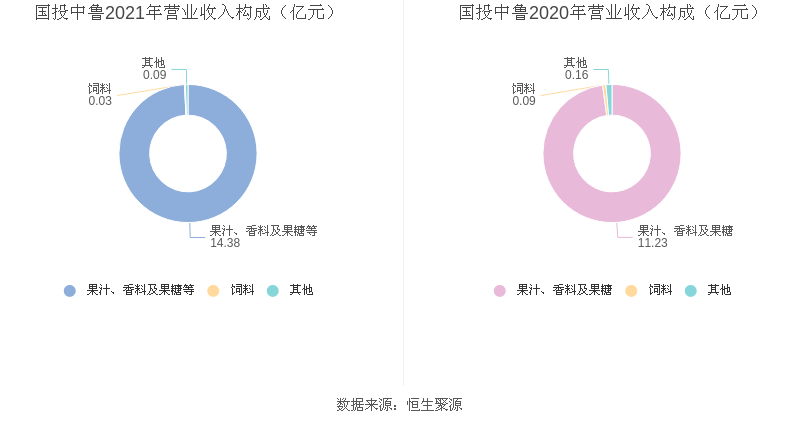 2021年度益达娱乐主营业务中,果汁、香料及果糖等收入14.38亿元,占营业收入的99.19%;其他业务收入0.09亿元,占营业收入的0.61%,同比下降43.99%;饲料收入0.03亿元,占营业收入的0.20%,同比下降67.52%。