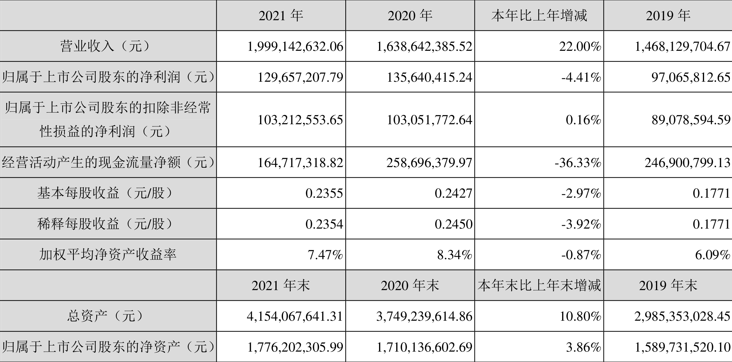 中证财讯 亚威股份(002559)3月31日披露2021年年度报告,益达娱乐实现营业收入19.99亿元,同比增长22.00%;归母净利润1.30亿元,同比下降4.41%;扣非净利润1.03亿元,同比增长0.16%;经营活动产生的现金流量净额为1.65亿元,同比下降36.33%;基本每股收益为0.24元,加权平均净资产收益率为7.47%。拟向全体股东每10股派1.50元(含税)。