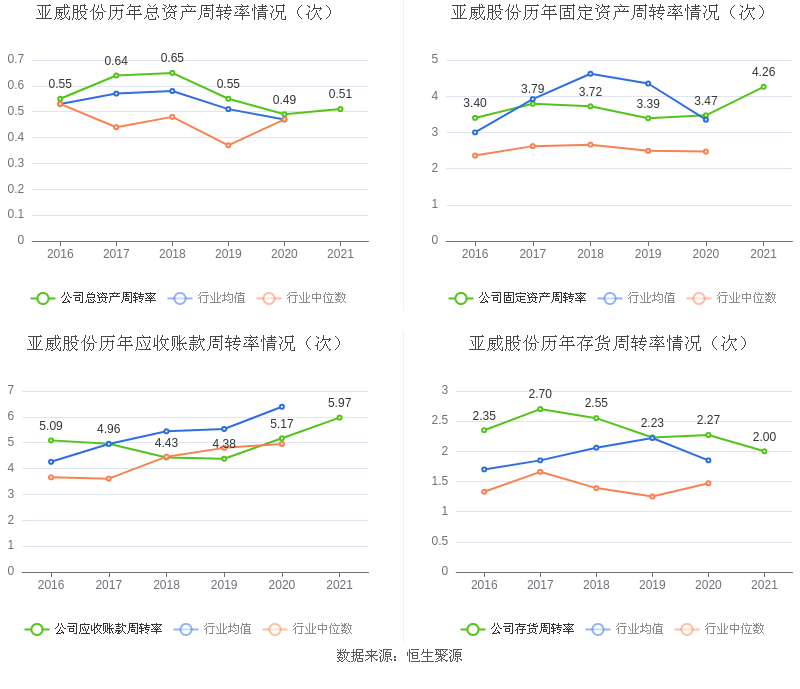 营运能力方面,2021年,益达娱乐总资产周转率为0.51次,上年同期为0.49次(2020年行业平均值为0.47次,益达娱乐位居同行业8/18);固定资产周转率为4.26次,上年同期为3.47次(2020年行业平均值为3.35次,益达娱乐位居同行业6/18);益达娱乐应收账款周转率、存货周转率分别5.97次、2.00次。