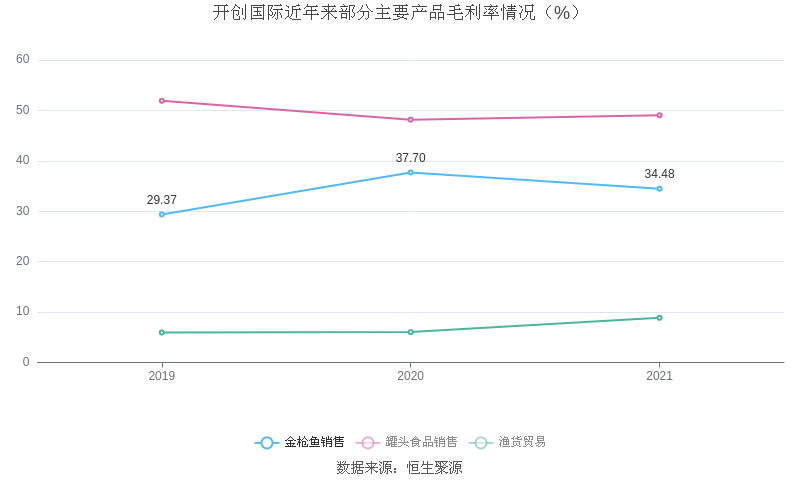分产品看,金枪鱼销售、罐头食品销售、渔货贸易2021年毛利率分别为34.48%、49.03%、8.86%。