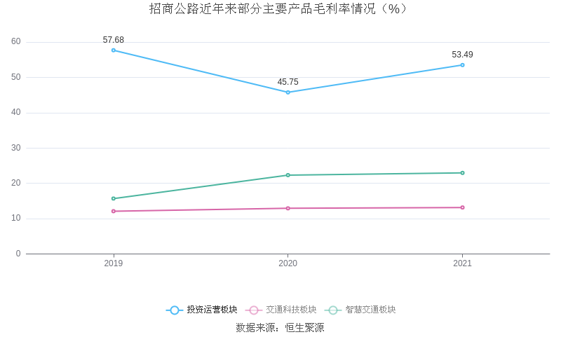 分产品看,投资运营板块、交通科技板块、智慧交通板块2021年毛利率分别为53.49%、13.16%、22.95%。