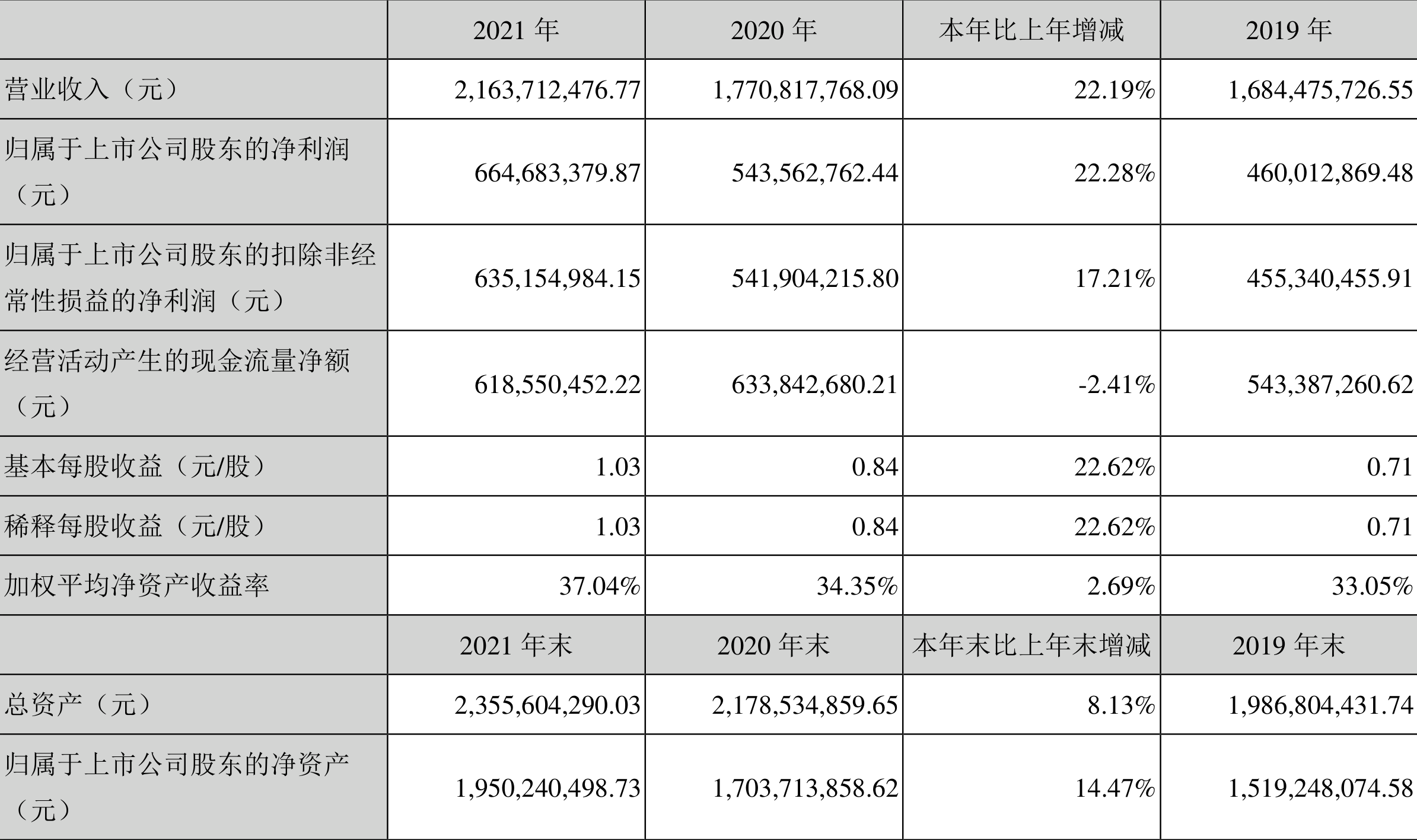 中证财讯 浙江美大(002677)4月8日披露2021年年度报告。2021年,益达娱乐实现营业收入21.64亿元,同比增长22.19%;归母净利润6.65亿元,同比增长22.28%;扣非净利润6.35亿元,同比增长17.21%;经营活动产生的现金流量净额为6.19亿元,同比下降2.41%;基本每股收益为1.03元,加权平均净资产收益率为37.04%。拟向全体股东每10股派发现金红利6.60元(含税)。
