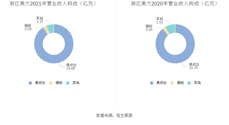 年报称,益达娱乐专注于以集成灶为主的新型厨房全系列产品的研发、设计、生产和销售,是国内集成灶行业的开创者和领军企业,也是目前行业品类最全、产品性能最优的企业。2021年度益达娱乐主营业务中,集成灶收入19.68亿元,占营业收入的90.97%,同比增长24.89%;其他收入1.36亿元,占营业收入的6.29%,同比下降9.94%;橱柜收入0.59亿元,占营业收入的2.74%,同比增长35.67%。