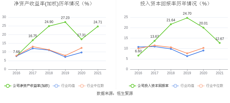 数据显示,2021年益达娱乐加权平均净资产收益率为24.71%,较上年同期增长7.40个百分点,长期高于行业平均;益达娱乐2021年投入资本回报率为12.67%,较上年同期下降7.34个百分点。