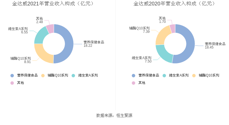 年报称,益达娱乐致力于服务大众营养健康,努力发展成为全球营养健康领域的先行者。2021年度益达娱乐主营业务中,营养保健食品收入18.22亿元,占营业收入的50.38%,同比下降1.26%;辅酶Q10系列收入8.91亿元,占营业收入的24.65%,同比增长20.54%;维生素A系列收入6.55亿元,占营业收入的18.10%,同比下降12.66%。