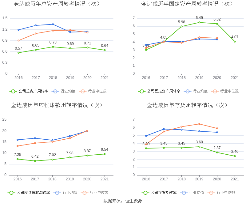 营运能力方面,2021年,益达娱乐总资产周转率为0.64次,上年同期为0.71次(2020年行业平均值为1.14次,益达娱乐位居同行业16/21);固定资产周转率为4.07次,上年同期为6.32次(2020年行业平均值为4.35次,益达娱乐位居同行业7/21);益达娱乐应收账款周转率、存货周转率分别9.54次、2.40次。
