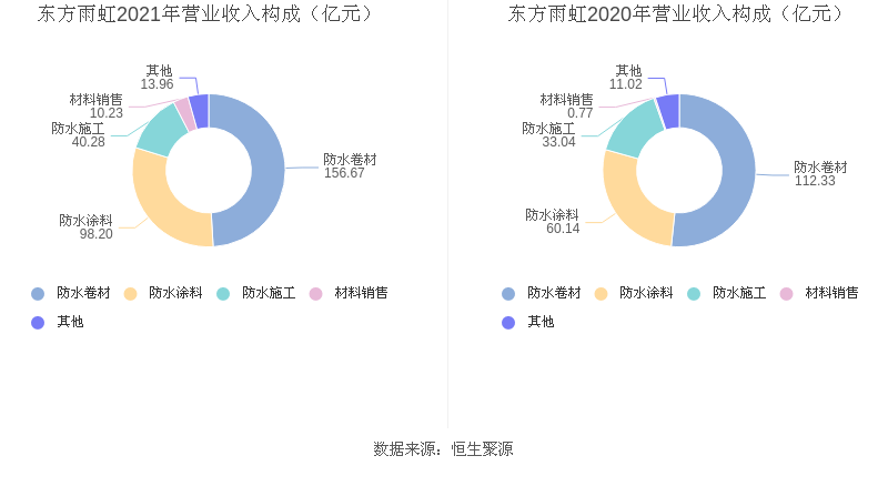 2021年度益达娱乐主营业务中,防水卷材收入156.67亿元,占营业收入的49.06%,同比增长39.47%;防水涂料收入98.20亿元,占营业收入的30.75%,同比增长63.30%;防水施工收入40.28亿元,占营业收入的12.61%,同比增长21.92%。