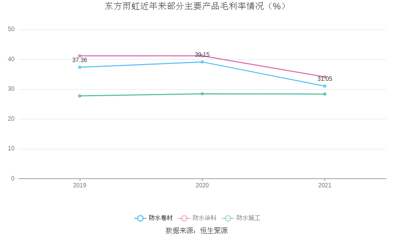 分产品看,防水卷材、防水涂料、防水施工2021年毛利率分别为31.05%、34.13%、28.38%。